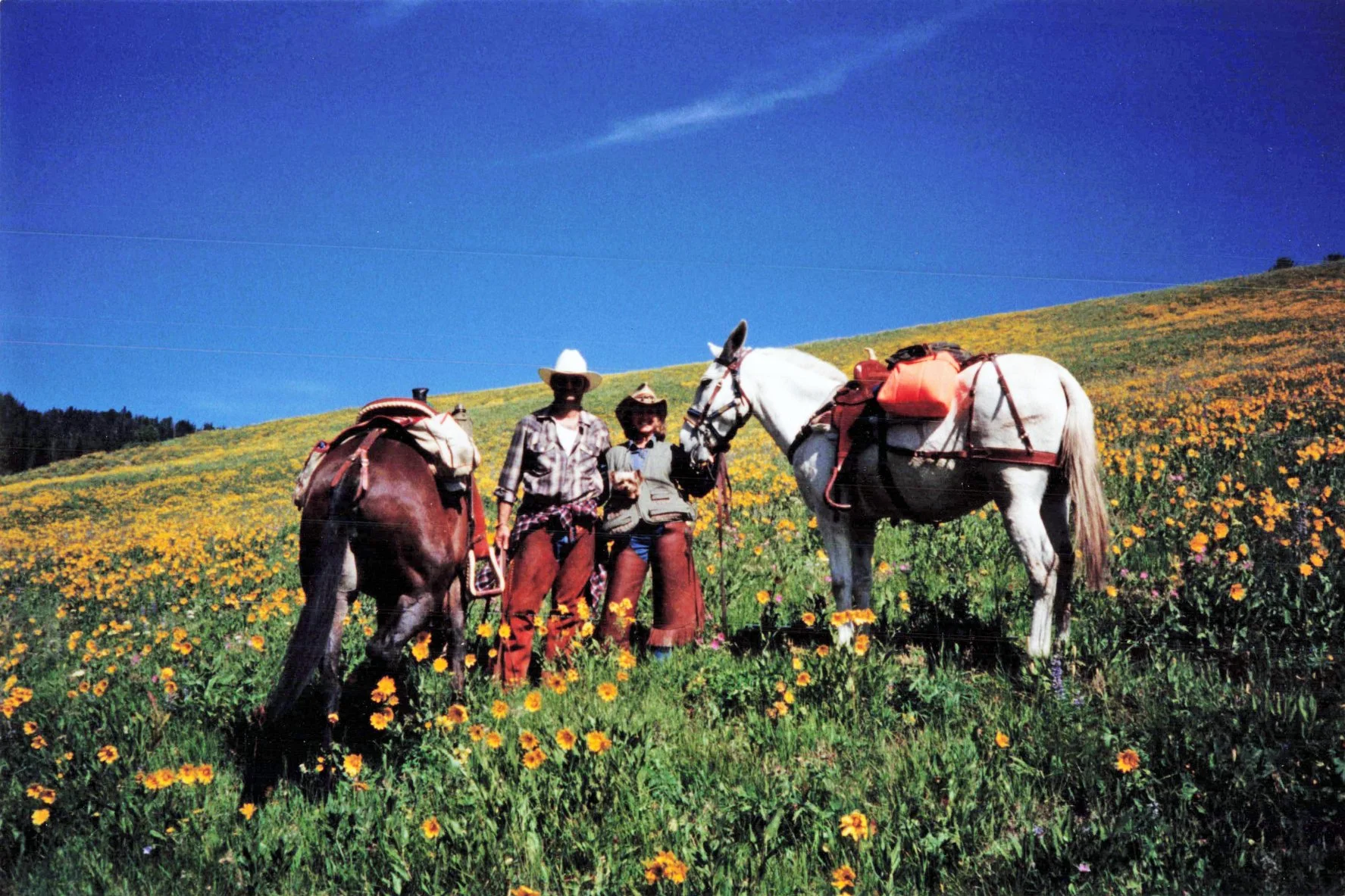Brad topped off our vacation by taking us on a three-day pack trip to Hell's Roaring. We started off in Yellowstone, WY, and rode to Hell's Roaring to camp, then out by way of Gardiner, MT. Fourteen miles in, we camped with wildflowers as far as you could see!